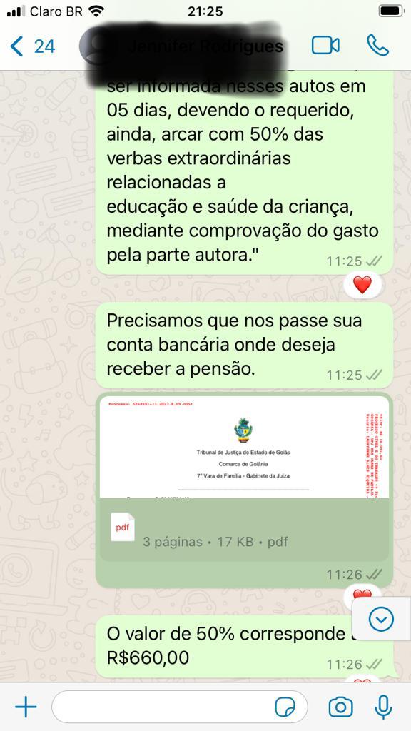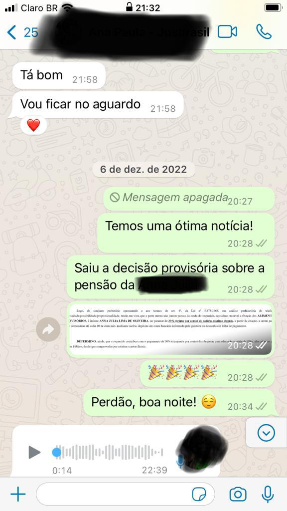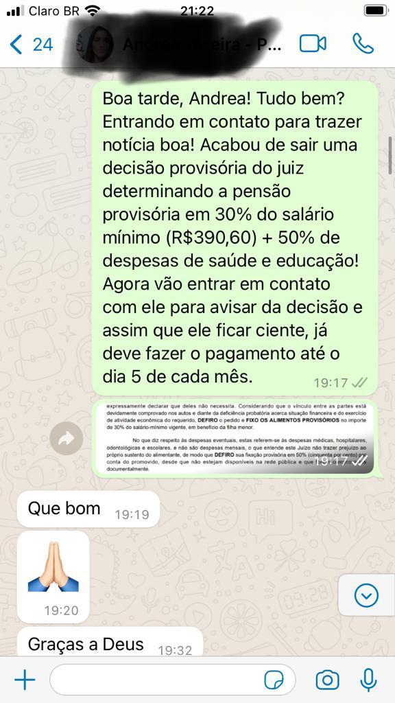 Cliente satisfeita com a sentença provisória de pensão alimentícia no importe de 50% do salário-mínimo vigente + 50% das verbas extraordinárias relacionadas a educação e saúde da criança.