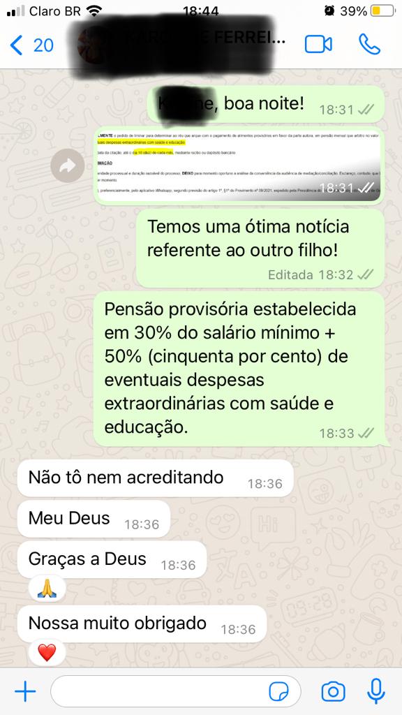 Cliente satisfeita com a sentença provisória de pensão alimentícia no importe de 30% do salário-mínimo vigente + 50% das verbas extraordinárias relacionadas a educação e saúde da criança.